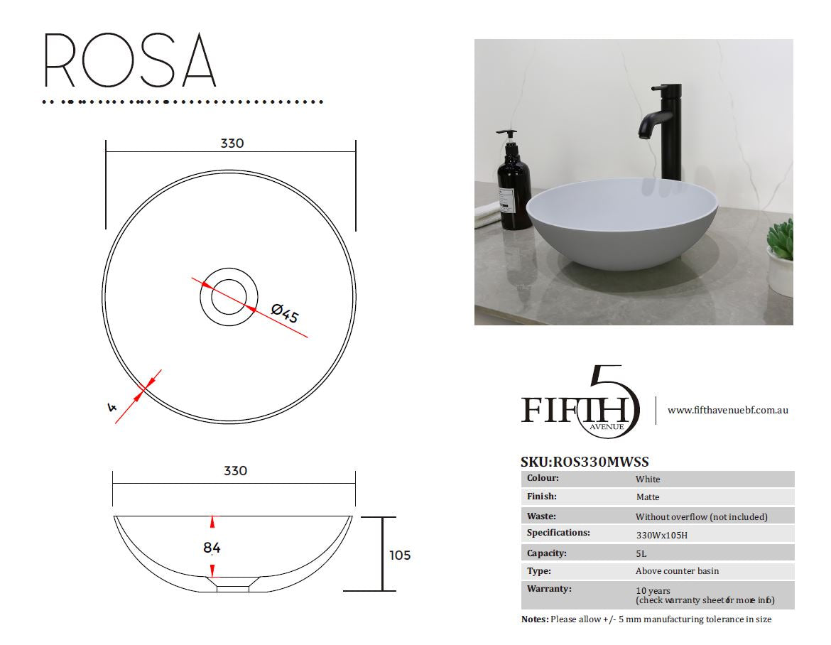 Fifth Avenue Rosa Solid Surface Basin 330mm