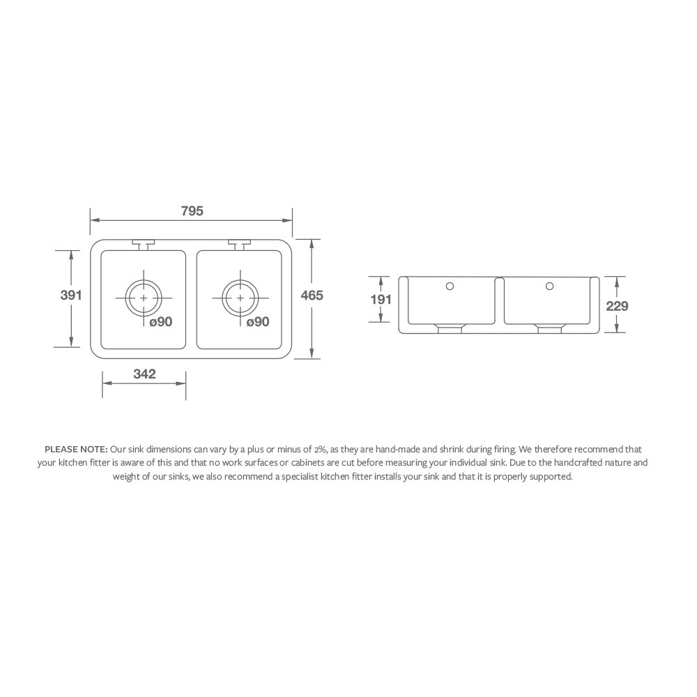 All dimensions are in mm. Dimensions may vary by up to plus or minus 2%; we recommend that customers do not cut out work surfaces or units until they have taken delivery of their sink. Because all our fireclay sinks are handmade using traditional methods, they are 100% unique. Slight variations in the finish from one sink to the next add character and are in keeping with the way these sinks have been made for the past 100 years.