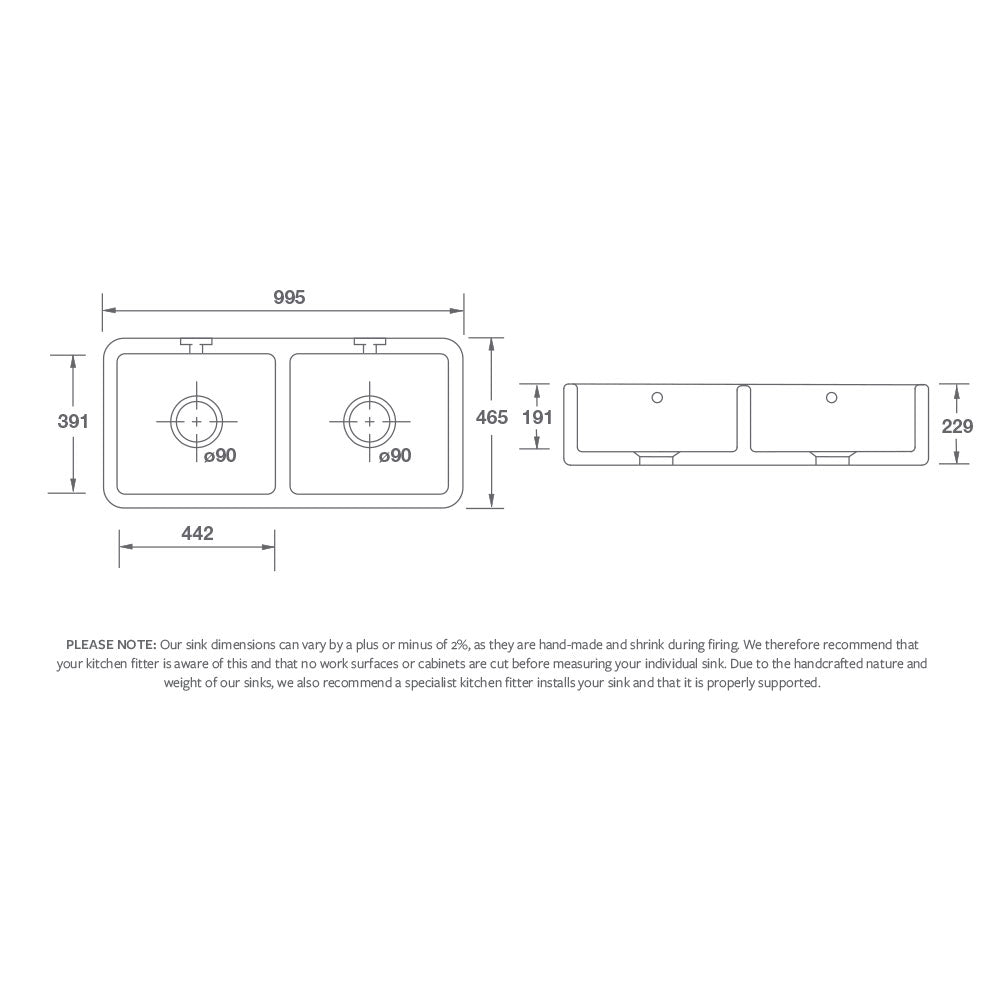All dimensions are in mm. Dimensions may vary by up to plus or minus 2%; we recommend that customers do not cut out work surfaces or units until they have taken delivery of their sink. Because all our fireclay sinks are handmade using traditional methods, they are 100% unique. Slight variations in the finish from one sink to the next add character and are in keeping with the way these sinks have been made for the past 100 years.