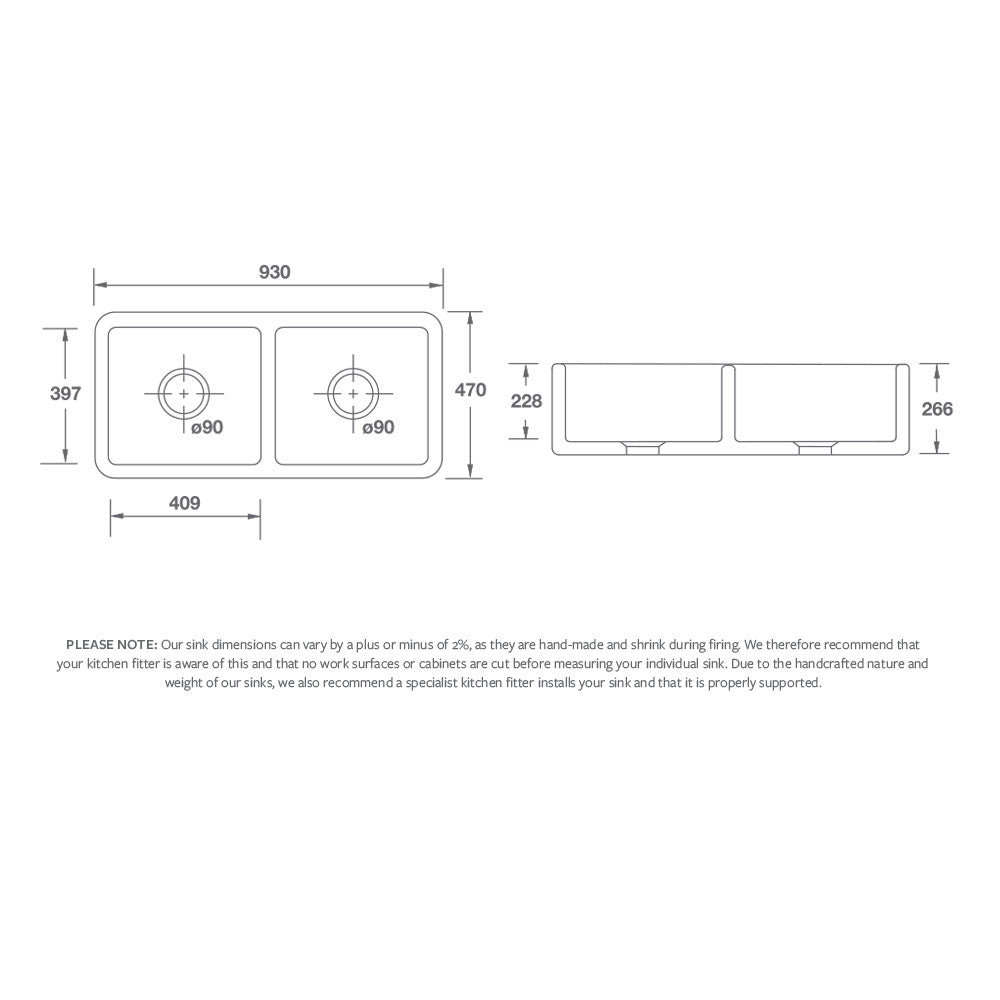 All dimensions are in mm. Dimensions may vary by up to plus or minus 2%; we recommend that customers do not cut out work surfaces or units until they have taken delivery of their sink. Because all our fireclay sinks are handmade using traditional methods, they are 100% unique. Slight variations in the finish from one sink to the next add character and are in keeping with the way these sinks have been made for the past 100 years.