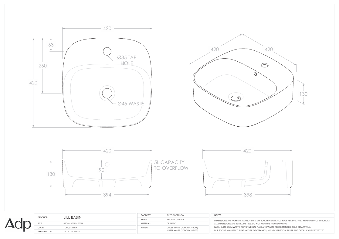 Due to the manufacturing nature of ceramic, size variation (+/-5mm) is to be expected. Dimensions are nominal, please measure your basin prior to installation.