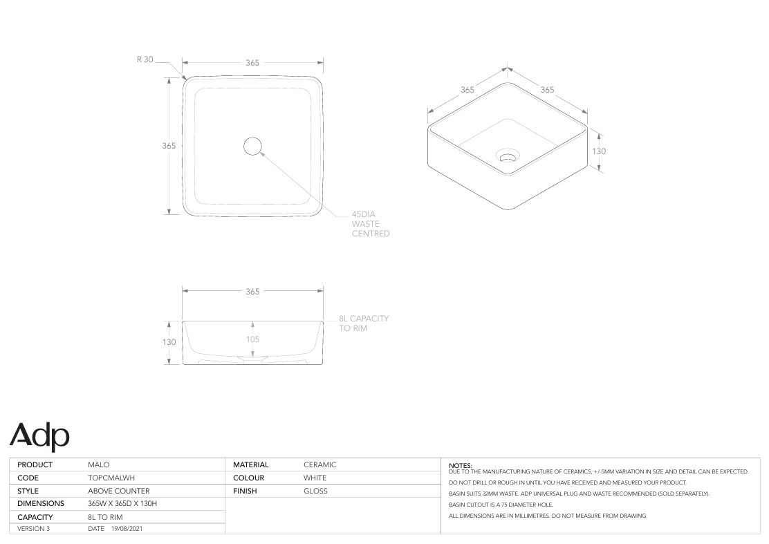 Due to the manufacturing nature of ceramic, size variation (+/-5mm) is to be expected. Dimensions are nominal, please measure your basin prior to installation.