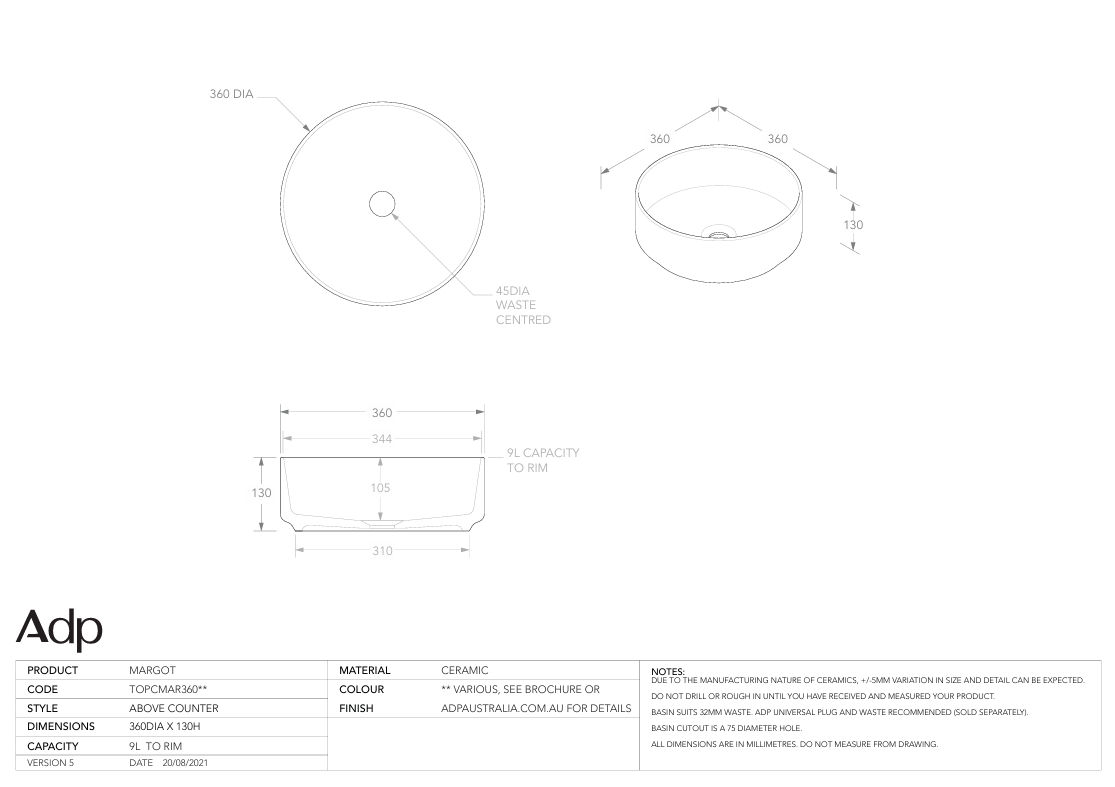 Due to the manufacturing nature of ceramic, size variation (+/-5mm) is to be expected. Dimensions are nominal, please measure your basin prior to installation.