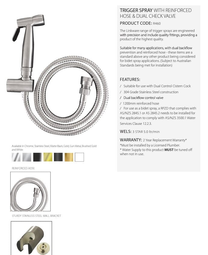 The Linkware range of trigger sprays are engineered with precision and includes quality fittings, providing a product of the highest quality. Suitable for many applications, with dual backflow prevention and reinforced hose – these items are a standard above any other product being considered for bidet spray applications. (Subject to Australian Standards being met for installation)