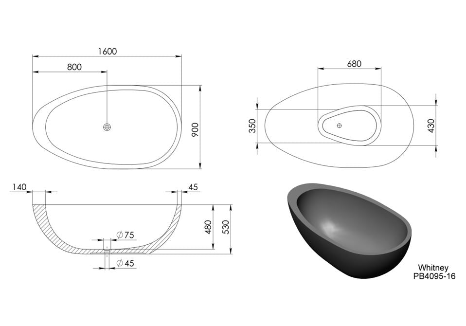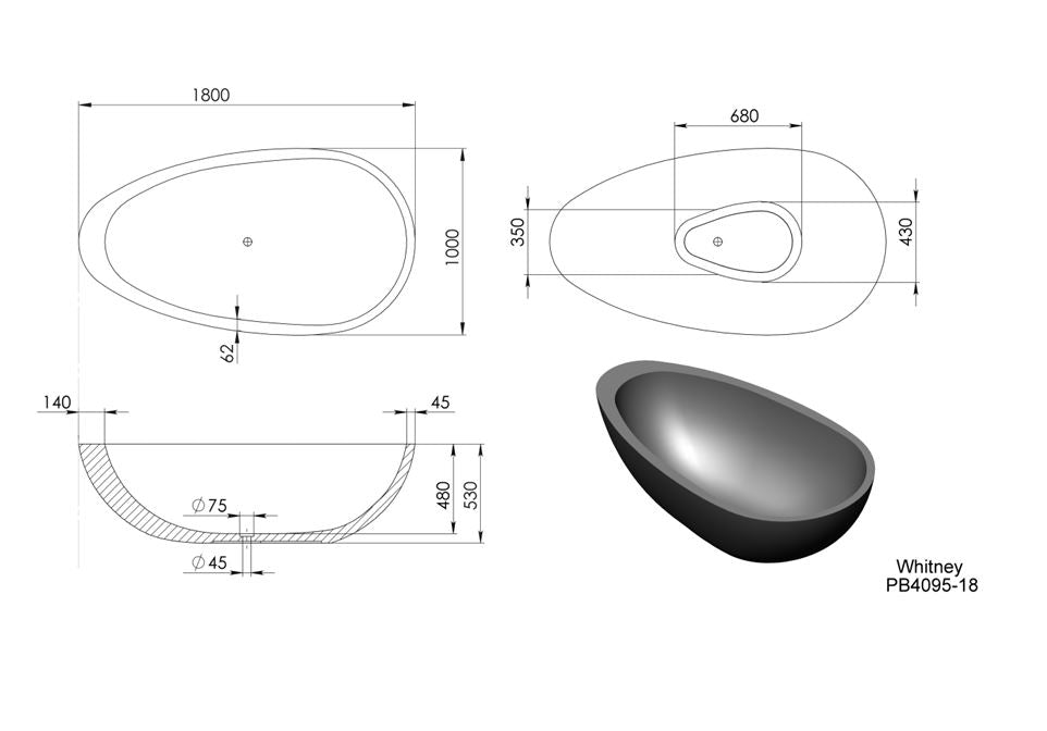 The Whitney freestanding bath presents a free-flowing design with beautiful curves, smooth lines and a thickened rimmed edge on one side. The Whitney stone bath is a statement piece that will bring a sense of tranquility into your bathroom.